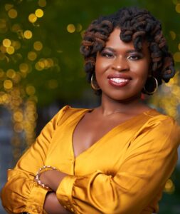 Romy Pickron, CFP®️ standing confidently with her arm folded in a bright mustard colored dress with a background of decorative lights.